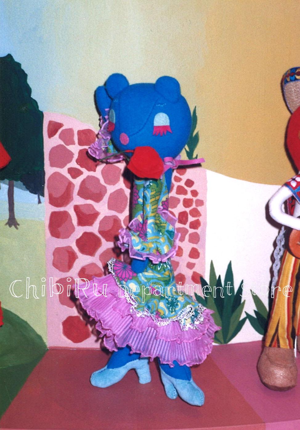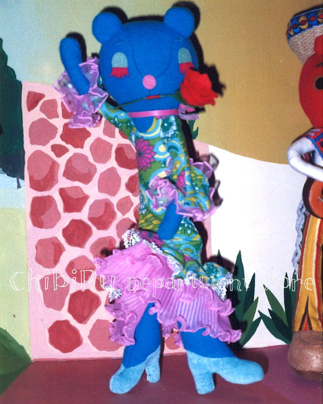 バラをくわえさせ、ファルダとよばれる衣装を着せる。衣装にはあの古着のワンピースの布とあのフリルのレースをつかって・・・というところまでは、いとも簡単にイメージできたのですが・・・実際につくってみたら、ポーズとかからだのバランスとか、なかなかむずかしかったです。